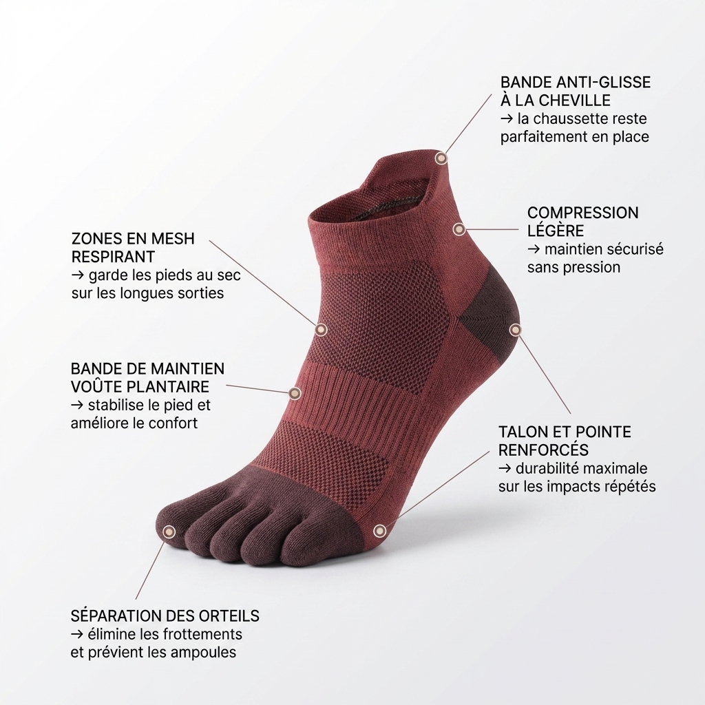 De la séparation des orteils au maintien de la voûte plantaire, chaque zone technique réduit la friction, améliore le confort et stabilise votre foulée.